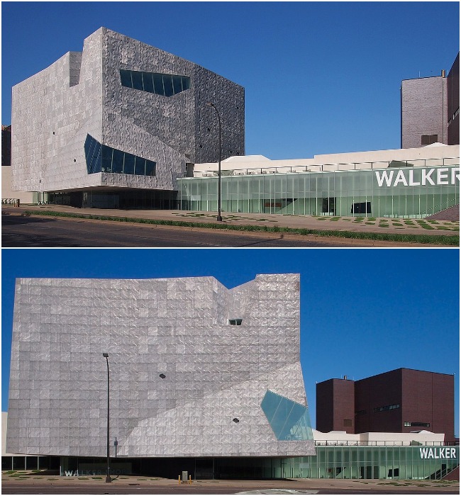 В Walker Art Center собраны произведения изобразительного и прикладного искусства, фотографии, достижения киноиндустрии (Миннеаполис, штат Миннесота). Культовое расширение: Учитывая, что WAC позиционирует себя как центр искусства, а не просто хранилище, специалисты Herzog & de Meuron старались следовать этой идее. Благодаря чему новое пространство является впечатляющей структурой, состоящей: из 7-этажной башни, облицованной тиснеными металлическими листами, сложенными так, чтобы напоминать фигурку оригами; театра Макгуайра на 385 мест; главной гостиной, окруженной тремя уровнями балконов, напоминающих планировку итальянского оперного театра и обширной облагороженной территории. Проект реконструкции также расширил Сад скульптур музея и добавил «застекленную улицу» – малоэтажную полупрозрачную конструкцию, которая соединяет старое здание и новый объект.