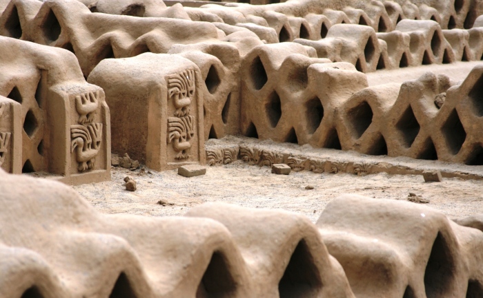 Все стены города украшены узорами, которые могли рассказать о верованиях, родовых символах власти, культуре и т. д. (Chan Chan, Перу).