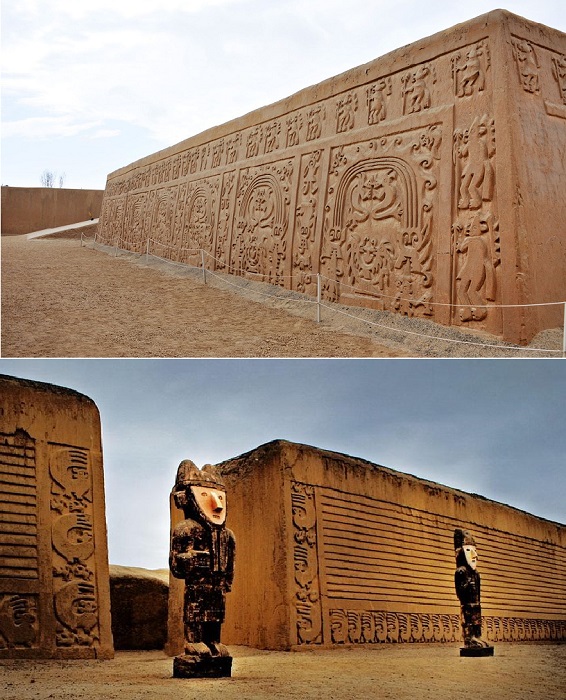 На севере Перу, недалеко от города Трухильо, пока еще можно увидеть один из самых невероятных примеров доколумбовых мегаполисов, точнее сказать, впечатляющие руины города Чан-Чан, повествующие об интересной истории и трагической судьбе. Единственный в Северной и Южной Америке глиняный город (такого масштаба) несмотря на то, что не раз оказывался на грани исчезновения, но до недавнего времени он восставал из руин. 1. История зарождения процветающего королевства Чимор и его столицы Чан-Чан Чан-Чан – крупнейший глинобитный город в Северной и Южной Америке и, хотя саман оказался не лучшим строительным материалом, мы еще можем увидеть уникальные шедевры (Перу). | Фото: timetravelturtle.com. В былые времена процветающий город Чан-Чан с населением от 30 до 60 тыс. человек занимал площадь более 2 тыс. га (Перу). | Фото: machutravelperu.com. Королевство Чиму (потомки вымершей культуры мочика (150-700 гг. н.э.) – одна из могущественных доколумбовых цивилизаций, достигших своего наивысшего расцвета в XV веке. История завоеваний земель, растянувшихся от южного Эквадора до побережья Перу на тысячу километров началась в VIII веке нашей эры и за весь период истории королевства к нему не просто присоединялись земли, они постепенно облагораживались, превращаясь в процветающие города и буйствующие сельхозугодья и это, в условиях бескрайней пустыни, образовавшейся на берегу Тихого океана. На одном из таких мест появилась и столица цивилизации Чимор (народ чиму), оставившая заметный след в истории континента и всего человеческого общества. Особая технология кладки сырцового кирпича не раз спасала столицу империи Чимор как от нашествия захватчиков, так и от сложных погодных условий (Chan Chan, Перу). | Фото: timetravelturtle.com. Примечательно: Свою столицу чиму назвали Чан-Чан (Chan Chan, Quingnam – «цзян» или «чанг»), что в переводе означает Солнце-Солнце. Предполагается, что его истинное название звучит так: Великое солнце, Сияющее солнце, Великолепное солнце (поскольку типичной особенностью языка куингнам является то, что удвоение или редупликация слова приобретает новое значение). По другой же версии (поскольку чиму не имели письменности, ученым приходится довольствоваться гипотезами), название происходит от термина шиан или сиан, где «ши» переводится как Луна, а «ан» — дом, что означает «Дом Луны». Это предположение лишний раз доказывает, что Луна была главным божеством королевства. Несмотря на то, что древняя цивилизация Чимор была высокоразвитым обществом, люди верили, что глиняные великаны защитят их от злых духов и недругов (Chan Chan, Перу). | Фото: machutravelperu.com. Глиняные скульптуры воинов по обнаруженным образцам были восстановлены современниками (Chan Chan, Перу). Рациональная экономическая деятельность, успешные военные кампании, политика сбора дани, техническое развитие – все это помогло построить город даже в настолько непригодном для жизни месте. Находясь в более 30 км от единственной полноводной реки в регионе, изобретательные по природе чиму смогли создать передовую по тем и последующим временам гидротехническую систему, позволяющую доставлять пресную воду по вырытым каналам в столицу, а по пути следования организовывать ирригационную систему для сельхозугодий. Как только питьевая вода появилась в столице, она начала активно развиваться и расстраиваться (изначально занимала площадь о