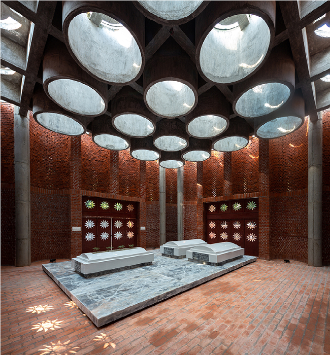 Думаете ушли те времена, когда для правителей и религиозных лидеров строили мавзолеи или гигантские усыпальницы. Как бы не так, в мире еще есть места, где почитают монархов и священников настолько, что строят грандиозные мавзолеи, которые, чаще, становятся не просто святыней для конкретной семьи, а общественным местом и настоящей достопримечательностью, особенно если за их создание берутся высококлассные специалисты. Именно так и произошло в Бангладеш, где совсем недавно появился Мавзолей в честь местного религиозного деятеля и членов его семьи. 1. Исламские традиции «Дом для земного тела»: в Бангладеш построили современную усыпальницу (Маникгандж). Лакомый кусочек земли в Южной Азии, в дельте рек Ганг, Мегхна и Брахмапутра всегда был зоной повышенного внимания со стороны как соседей, так и тех народов, монархи которых решили, что они властители мира. На благодатных землях с теплым климатом и плодородной почвой люди появились около VII-VI вв. до нашей эры. А к VII веку (по XII) в устье реки Ганг процветало Бенгальское государство, которое долгое время считалось раем на земле, что не могло не привлечь мусульман, то и дело затевавших захватнические походы. Мавзолей расположен на территории поместья семьи видного религиозного деятеля, в честь которого и возводили усыпальницу (Маникгандж, Бангладеш). | Фото: archdaily.com. Ислам как религия стал появляться в регионе Бенгала в XII веке. Арабские торговцы и миссионеры-суфиями начали распространять свою религию, а последующие захватнические походы мусульман привели к тому, что к XVI веку процветающее государство было подконтрольно империи Великих Моголов, а его столица Дакка стала ее административным центром. Это обстоятельство привело к полномасштабной исламизации населения, при этом вместе с религией перекочевали и многие традиции, связанные с государственными устоями, бытом, семейными отношениями и смертью. Архитекторы приложили максимум усилий, чтобы усыпальница органично вписалась в сад (Маникгандж, Бангладеш). | Фото: archidiaries.com. Согласно верованию суфиев, которые в свое время обратили значительную часть населения (суфизм – мистико-аскетическое течение в исламе, появившееся в VIII–IХ вв.) для религиозных лидеров и правителей (султанов) строились мавзолеи, которые считались «домом для земного тела» (они же дарги), обеспечивающие души умерших доступом к высшей силе. Таким порталом служила «люстра рая», установленная на крыше усыпальницы. Это самая впечатляющая часть конструкции любой дарги, ведь свет, проникая сквозь специальные отверстия рассеивался, создавая «таинственную небесную атмосферу, которая интригует и подогревает веру во Всевышнего». 2. Современное видение усыпальниц архитекторов студии Sthapotik Традиционная усыпальница дарга и современная интерпретация исламских канонов (Маникгандж, Бангладеш). Среди живописного района в городе Маникгандж специалисты местной студии Sthapotik завершили строительство мавзолея, в проекте которого соединись исламские традиции, восходящие к суфийским представлениям о жизни и смерти, с современным видением архитекторов сакральной структуры. Дизайн и строительные технологии были основаны на местных материалах и полностью отвечают культурным традициям возведения дарг (в переводе с персидского означает «портал»), служащих последним пристанищем д