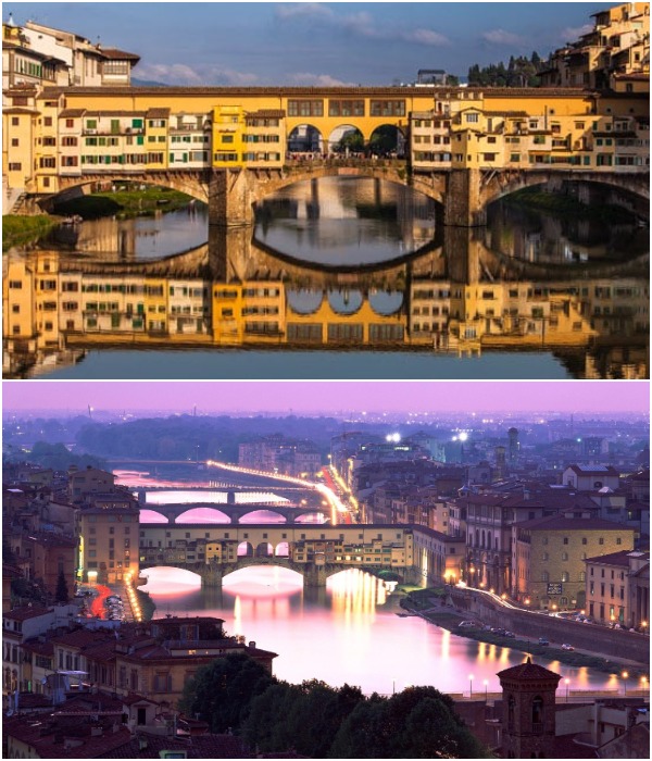 Понте Веккьо можно считать прототипом особенного рода переправ, предусматривающих строительство задний на их полотне. Ponte Vecchio, построенный в 1345 году, является одним из четырех сохранившихся мостов, где в два ряда построены капитальные здания. Их использовали в качества торговых лавок, небольших мастерских и жилищ для владельцев или работников. А вот самый верхний уровень оборудовали для герцога Козимо I, для которого был сделан собственный коридор, чтобы его сиятельство не встречалось с простолюдинами и торговцами, пересекая реку Арно. На данный момент нижний уровень все так же занимают торговые люди, привлекая колоритными безделушками, традиционными изделиями и ювелирными украшениями туристов, на втором уровне, как и прежде, живут люди (хотя имеются и офисные пространства). Ну а коридор Вазари преобразован в картинную галерею.
