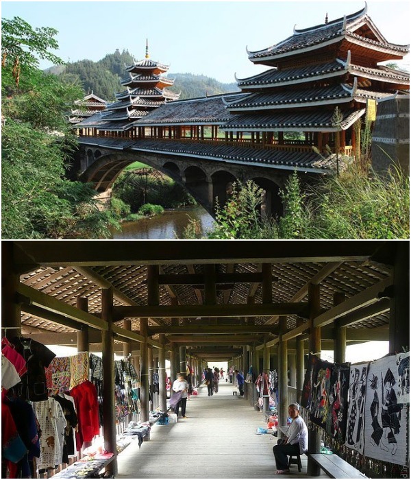 Пешеходно-торговый мост Дождя и Ветра – это сборная конструкция переправы, созданная без единого гвоздя (Гуанси, Китай).
