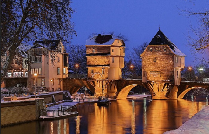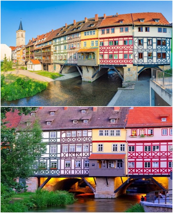 Торговый мост Кремербрюке, построенный в 1325 году, является фундаментом для 32 жилых фахверковых домов и различных магазинчиков (Эрфурт, Германия).