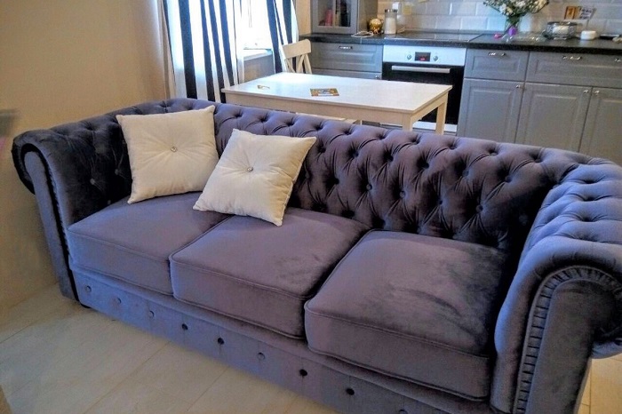 С велюровой обивкой примерно та же ситуация, что и с мрамором. Она выглядит дорого и стильно, является приятной на ощупь, а цвета, представленные в палитре, смотрятся глубже и интереснее, чем на других материалах. Но если вы примите решение купить такой диван, будьте готовы к постоянному уходу за ним, иначе он быстро потеряет свой красивый внешний вид. Велюр – настоящий магнит для пыли, шерсти, волос. Кроме того, его нельзя ставить рядом с окном, иначе со временем уменьшится прочность ткани, плюс она выгорит. А еще материал быстро впитывает влагу, поэтому нельзя допускать, чтобы пятна въедались в ткань – их нужно устранять сразу. В качестве компромисса, можете отдать предпочтение синтетическому велюру – он проще в уходе, а выглядит так же роскошно.