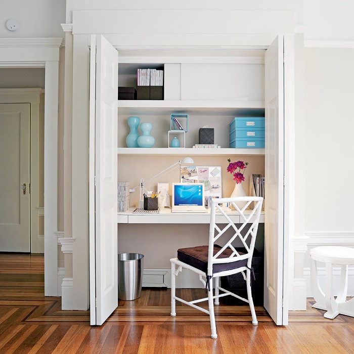 Если в квартире предусмотрено много систем хранения или у вас просто мало вещей, используйте нишу, предназначенную для обустройства шкафа, в качестве мини-кабинета. Мебель должна быть максимально минималистичной – громоздкий стол замените на подвесной, массивное кожаное кресло – на лаконичный стул с комфортным сиденьем и спинкой. Дополните картинку несколькими полками для хранения, и этого хватит для того, чтобы вы продуктивно работали и чувствовали себя здесь максимально удобно.