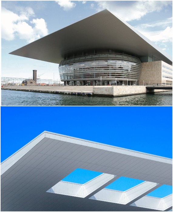 Новое здание оперного театра Копенгагена может похвастаться уникальной конструкцией масштабной крыши, имеющей длину 158 метров при ширине 90 метров. Крыша завораживает сразу по нескольким причинам: ее площадь превышает 14 тыс. кв. метров, консольная часть выступает без дополнительных опор на 41 метр, она очень тонкая и полая. Еще одно интересной особенностью является тот факт, что задняя (восточная) и передняя (западная) части крыши не соединяются между собой, поэтому каждая сторона является независимой кровельной структурой. Несмотря на то, что эти части очень похожи, но самой большой головной болью оказалась передняя ее часть, ведь она выходит далеко за стены здания. Свес крыши колеблется от 21 метра по бокам, и до 41 метра в центре конструкции, что требовало неординарного подхода к проектированию и инженерным расчетам.