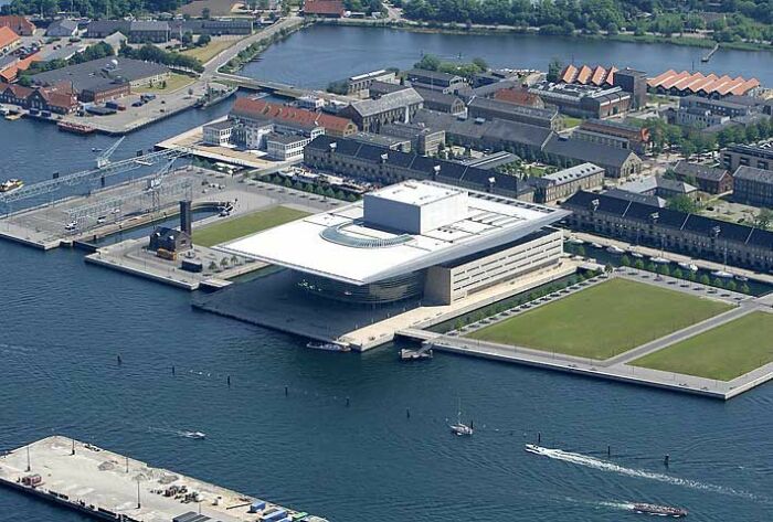 На месте старых доков выросло неофутуристическое здание, призванное стать главным культурным центром столицы и всей Дании (The Royal Danish Opera, Копенгаген).