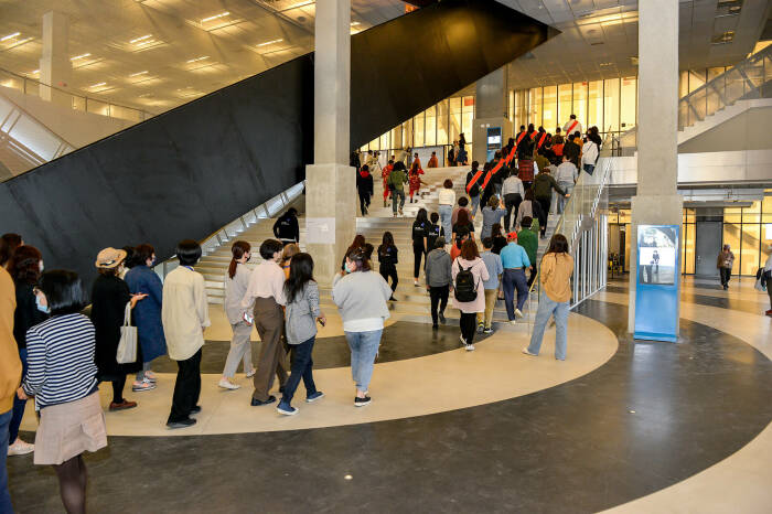 Фойе стало распределительной точкой, хотя уже здесь можно погрузиться в мир театрального закулисья (Taipei Performing Arts Center, Тайвань). | Фото: stirworld.com.