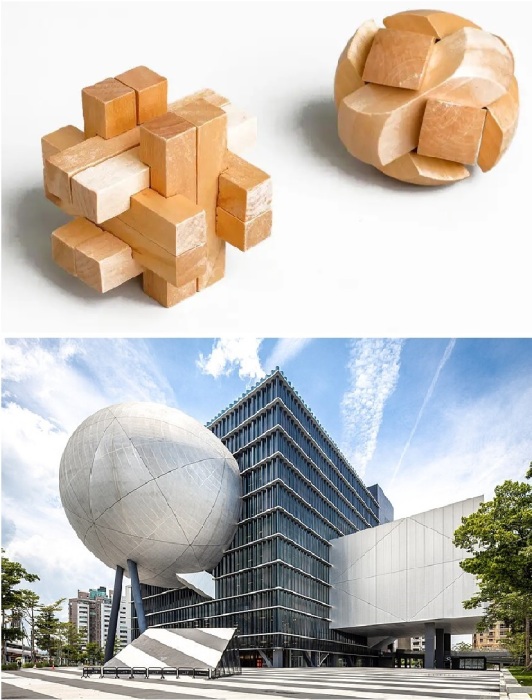 Традиционная китайская головоломка из простых деревянных деталей вдохновила на создание удивительной конструкции многофункционального здания (Taipei Performing Arts Center, Тайвань). Главная идея: Разработчики взяли за основу традиционную китайскую головоломку, сделанную из дерева. В результате здание культурного центра включает в себя три масштабных элемента, представляющие собой независимые, но взаимосвязанные структуры, выступающие из компактного центрального куба. Асимметричное чудо архитектуры состоит из Большого театра, рассчитанного на 1,5 тыс. мест, Многопрофильного театра, рассчитанного на 800 зрителей и Театра авансцены на 800 человек. Как отмечает Дэвид Джаноттен, соучредитель и управляющий компании OMA: «Конфигурация трех театров, «подключенных» к центральному кубу, привела к новой внутренней работе исполнительских пространств, чтобы вдохновить на невообразимые постановки. Мы довольны тем, что неординарные пространства позволяют создавать все новые и новые связи между актерами, художниками, зрителями и посетителями Центра».
