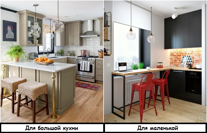 В последнее время этот прием в оформлении кухонь является невероятно популярным. Практически каждая хозяйка мечтает о таком предмете интерьера, ведь он ассоциируется с роскошью загородных домов и делает внешний вид комнаты намного дороже (особенно если использовать изделия из натуральных материалов). Но, увы, остров уместен только в случае с большой кухней – в маленькой он будет смотреться неуместно, и занимать слишком много места. Лучше в качестве дополнительной рабочей поверхности использовать подоконник. Или же, если вы так мечтаете об острове, установите его вместо обеденного стола. Правда, в этом случае придется покупать барные стулья.