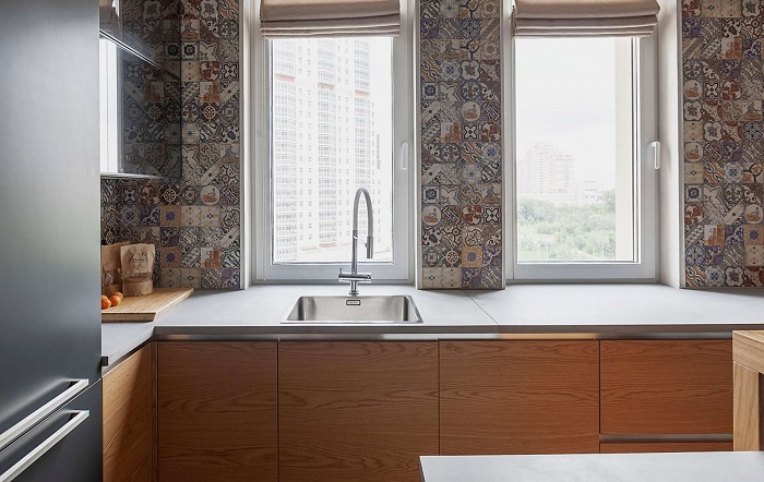 • возможность одновременно мыть посуду и любоваться видом из окна (если он действительно красивый); • хорошее освещение зоны в дневное время суток (можно будет экономить на электроэнергии); • экономия пространства, так как раковину обычно устанавливают на увеличенном подоконнике, который одновременно является и рабочей поверхностью. Подобная конфигурация позволяет более разумно распорядиться имеющейся площадью (актуально для маленькой кухни или кухни-гостиной).