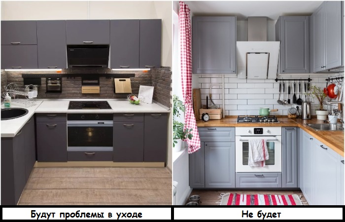 При выборе цвета для новой кухни большинство людей склоняются к темным оттенкам, так как считают, что они менее маркие, чем светлые. На самом деле на таких фасадах видны любые загрязнения, особенно если поверхность глянцевая. Отпечатки пальцев, потеки от воды, следы жира – все будет максимально заметно. Именно поэтому в последнее время все реже делают черные, темно-синие, коричневые кухни, отдавая предпочтение светлым тонам. Если же вы твердо настроены заказать темные фасады, используйте материалы, имитирующие дерево. Благодаря их фактуре загрязнение будет меньше бросаться в глаза.