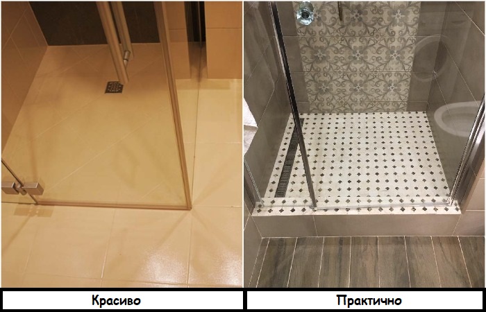 Выглядит красиво, но в эксплуатации проявляет себя не самым лучшим образом. Перед душевой кабиной всегда образовывается лужа, и есть риск поскользнуться и упасть, больно ударившись о плитку. Во избежание таких последствий придется после каждого принятия душа брать тряпку и насухо вытирать пол, что не очень удобно. Если не хотите делать высокий порожек, оформите едва заметный перепад – его будет достаточно для того, чтобы возле кабины не скапливалась вода.