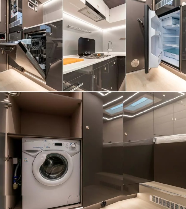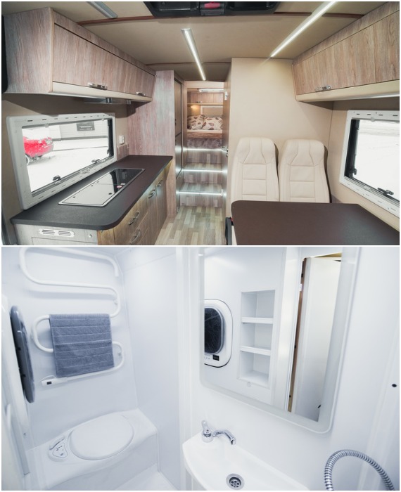 На базе автобуса ПАЗ «Вектор Next» (выпускает Павловский автобусный завод) разработчики завода спроектировали довольно вместительный кемпер, который легко можно сравнить с квартирой «евродвушкой» причем, как по размерам, так и по стоимости (от 5,8 миллиона рублей!). Шокирующая цена оправдана тем, что комфортом и уютом дом на колесах ничем не уступает традиционной малогабаритной квартире или студии. Ну, по крайней мере, по количеству необходимой техники, мебели, сантехнического оборудования и набору бытовых удобств. На полезной площади 18 квадратных метров удалось разместить все необходимое и даже полноразмерное (холодильник, стиральная машина/посудомоечная машина, полностью благоустроенная кухня, спальня, ванная комната с душевой и туалетом, масса ящиков, полок и встроенных систем хранения, сплит-система и т.д.) благодаря оптимизации пространства и многофункциональной трансформирующейся мебели. При этом комплектация и обустройство жилого пространства рассчитаны не на краткосрочный отдых как в преобразованной Lada Granta, а уже на длительное проживания по меньшей мере двух взрослых человек, хотя и гостей получится принимать, которых можно будет оставить на пару тройку дней с ночевкой.