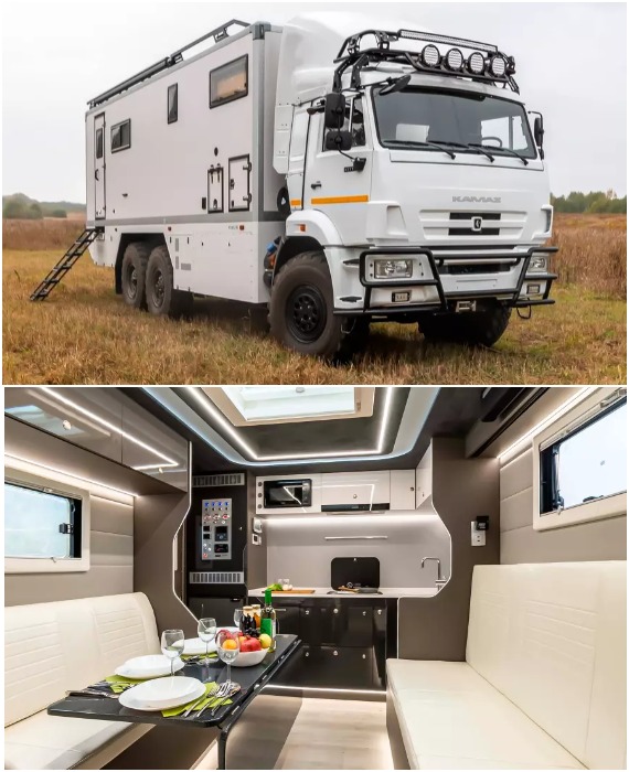 Современная обстановка и комфортные условия позволяют жить в доме на колесах неограниченное время и в любых климатических зонах (КАМАЗ-43118 Волгатрейд).