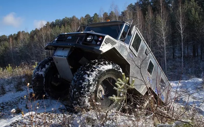 Вездеход-амфибия «Бурлак» может запросто преодолевать водные преграды и снежные заносы.