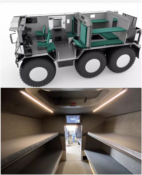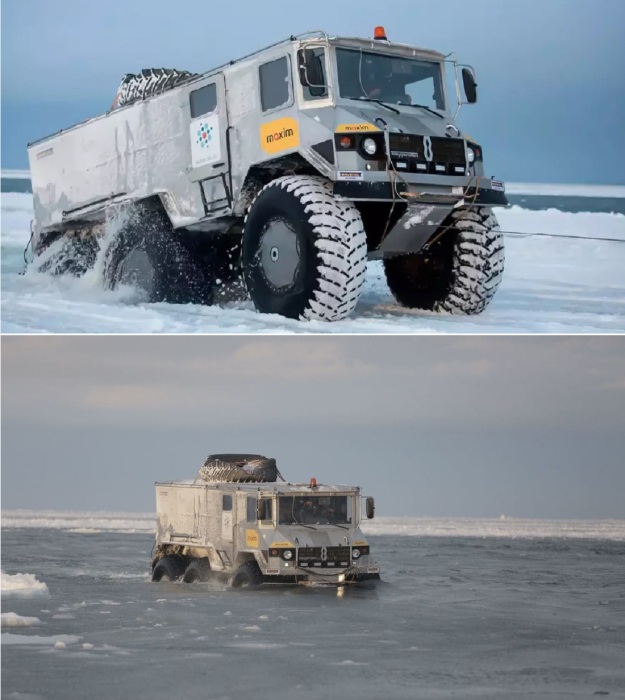 Учитывая проходимость вездехода с дорожным просветом, достигающим 75 сантиметров (кресло водителя находится на уровне второго этажа панельного жилого дома!) и то, что его можно эксплуатировать в суровых условиях Арктики, конструкторы изначально сделали все, чтобы люди не только не замерзли или задохнулись от жары (если решат покорять барханы пустыни), но и могли не переживать из-за отсутствия воды, еды или топлива. В одном из люков предусмотрена снегоплавильная установка, которая позволяет добывать воду простейшим способом – насыпать на него слой снега и немного подождать, вода сама стечет в накопительный бак, а затем и поступит. При этом имеются дополнительные огромного размера баки для топлива, что при сравнительно небольшом расходе дизельного топлива (как для такой «игрушки») запас хода вездехода амфибии составляет до 2,5 тыс. км, так что скрупулезно прокладывать маршрут, проходящий мимо заправок, не придется. Внутри же имеются вместительные системы хранения, в которых помещается немало съестных запасов.