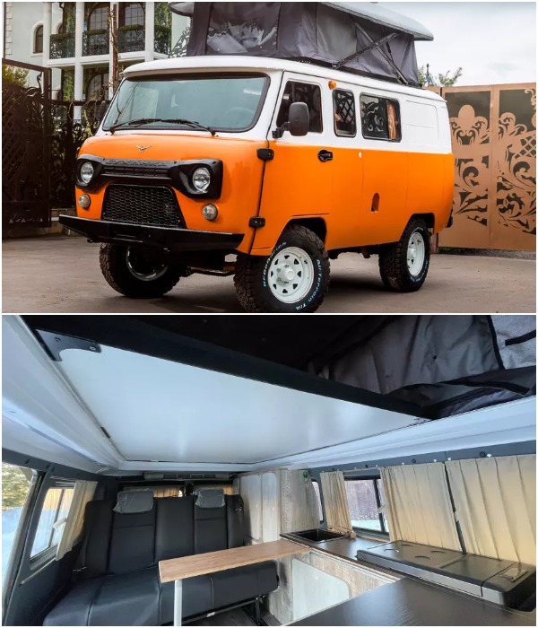 Легендарная «Буханка» или советский внедорожник, имеющий достаточно высокий уровень устойчивости, мощности и прочности, созданный в 1958 году значительно преобразился, после того как из него решили сделать апартаменты сразу на четверых человек. Для этого у него предусмотрен второй этаж (!), который появился вместо традиционной крыши. Правда, его боковые стороны сделаны из не продуваемой, влагостойкой ткани и придется потрудиться, чтобы изнутри фургона надстройку с дополнительными спальными местами все-таки поднять и закрепить. Но те, кто решается покупать автомобили УАЗ готовы и не к таким испытаниям, так что большой неожиданностью такой нюанс не станет. Зато пару минут усилий и вся честная компания, отправившаяся в путешествие или командировку может в довольно приличных условиях пообедать и даже выспаться с комфортом.