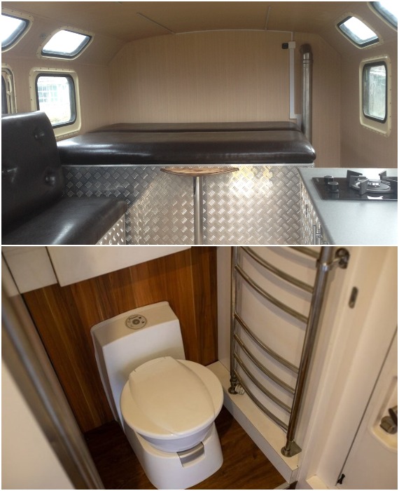 Если некоторым предыдущим моделям автодомов под силу преодолеть любые дороги, то «Бурлаку» они вообще не нужны. И даже если на его пути встретится водоем, путешествующим не придется делать крюк, чтобы объехать преграду, ведь это вездеход-амфибия, у которого имеется винт, позволяющий нести 1,5 тонны груза на скорости 6,5 км/ч. Но и это еще не все преимущества такого рода дома на колесах. Учитывая его длину в 7,5 метров (многие владельцы крошечных дачных домиков могут позавидовать его простору), путешествующей группе людей ютиться не придется. Ну а если учесть, что разработчики потрудились на славу, используя каждый квадратный сантиметр внутреннего пространства, то становится понятным, почему вездеход-амфибия «Бурлак» считается одним из самых крутых автодомов не только на отечественных просторах. Здесь предусмотрена гостиная-столовая с обеденной зоной и кухней, полноценная ванная комната с туалетом и душевой кабиной, отдельной спальной комнатой (такой себе купейный вагон с отдельными спальными полками), при этом все диванчики гостиной превращаются в огромную кровать, где может поместиться до 4 человек. Естественно, с роскошным жилым модулем КАМАЗа-43118 Волгатрейдом даже сравнивать не стоить, но для тех, кому по долгу службы (геологоразведочные группы, исследователи, военные и др.) приходится преодолевать сотни километров в глуши, а порой и в суровых климатических условиях, «Бурлак» является просто находкой.
