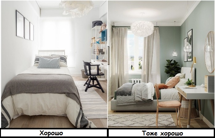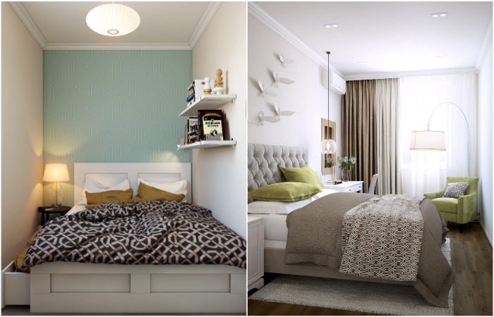 Маленькая спальня – это не приговор и не повод расстраиваться. Более того, ее гораздо проще сделать уютной, прямо как в ваших любимых интерьерных блогах. Лофт, сканди, минимализм, классика – доступны любые стили. Главное – знать несколько нюансов о грамотном оформлении небольшого пространства, чтобы спальня получилась не только красивой, но и функциональной.1. С чего начать? Продумайте, какая мебель и аксессуары должны присутствовать в комнате Для начала необходимо подумать, какие вещи вам необходимы для комфортного пребывания в спальне, и составить список. Для удобства ответьте себе на несколько вопросов. Нужен ли туалетный столик? Будете ли вы хранить здесь постельное белье? Нуждаетесь ли в отдельной рабочей зоне? Хотите спать на классической кровати, раскладном диване или обустроить специальный подиум с местами для хранения? А может вам в спальне нужно место под синтезатор, ведь вы увлекаетесь музыкой? Классическое оформление комнаты, где есть кровать, шкаф, комод и прикроватные тумбы, конечно, имеет право на жизнь, и воплотить его проще всего. Однако это совсем не значит, что все эти предметы будут соответствовать вашим потребностям. Поэтому в первую очередь ориентируйтесь на свои пожелания, а уже потом ищите подходящую картинку на Pinterest, если вам сложно самостоятельно визуализировать интерьер, о котором мечтаете. 2. Какую планировку выбрать? По бокам от кровати должно оставаться свободное место. / Фото: rstart-shop.ru Лучше всего рисовать схему спальни на бумаге, а не у себя в голове. Тогда получится четко все выстроить и избежать ситуации, когда тумба не влезла между стеной и кроватью, а дверцы шкафа перестали открываться из-за непосредственной близости другой мебели. Помните, что и слева, и справа от постели необходимо оставить минимум по 40 сантиметров (лучше 60 сантиметров) для комфортного передвижения. Если вы планируете установку распашного шкафа (хотя дизайнеры рекомендуют выбирать для крохотной спальни шкаф-купе), не забудьте оставить достаточно свободного места для открывающейся створки. В противном случае придется каждый раз отодвигать в сторону стул, тумбочку или другую мебель, которая мешает. Между телевизором и вашим лицом должно оставаться не менее полутора метров, чтобы не страдало зрение. И последнее: старайтесь не нагружать спальню мебелью. Если есть возможность оставить только кровать, напольную вешалку и зеркало в полный раз – сделайте это. Чем больше пространства и воздуха будет в комнате, тем комфортнее и расслабленнее получится обстановка, а значит, вы будете крепче спать. 3. Какой стиль лучше? Примеры спален в стиле сканди и прованс Здесь нет однозначного ответа, все зависит от ваших личных предпочтений. Кому-то комфортно в светлом сканди, кому-то – в брутальном лофте, кому-то – в романтичном провансе. Кстати, сейчас очень редко можно встретить интерьер в чистом стиле – обычно дизайнеры одно направление берут за основу, а дополняют его деталями из другого. Обратите внимание, что «по канону» необходимо подбирать мебель, отделку, светильники, основную цветовую гамму, а вот текстиль, декор и акценты могут быть любыми и меняться под настроение или же в соответствии с сезоном. 4. Яркие цвета – это плохо? В интерьер могут присутствовать и светлые, и более насыщенные цвета Нет, это хорошо, но почему-то многие их б