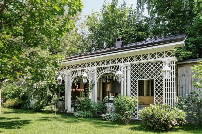 Перголы, примыкающие к стене дома, создают атмосферу колоннады, защищая окна и двери от прямых солнечных лучей и создавая уютную террасу-столовую, окруженную зеленью и погруженную в тень.