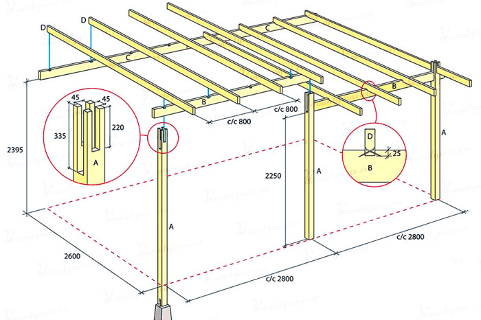 Пергола — прекрасный элемент ландшафтного дизайна, который добавляет элегантность и шарм на участке. Сделать перголу из деревянного бруса можно своими руками, следуя нескольким простым шагам. Ее основное назначение – создание уютной и комфортной зоны для отдыха на открытом воздухе. Форма может быть абсолютно любой /Фото: mykaleidoscope.ru Пергола – это архитектурный элемент, который представляет собой открытую конструкцию из столбов и балок, часто увитую плющом или другими растениями. Перголы могут использоваться как навесы над террасами или беседками, а также как элемент декора сада или двора. Они защищают от палящего солнца и создают тенистое место для отдыха. Кроме того, перголы могут служить опорой для вьющихся растений, что добавляет им эстетичности и уюта. Поэтому часто являются популярным выбором для обустройства летних площадок и садов. Они также могут выступать как павильоны над прогулочной дорожкой и быть частью архитектурного комплекса, придавая ему уникальный облик. Такая галерея обычно является мостом между зданием и террасой или бассейном, при этом выполняя не только функциональную, но и декоративную роль в общем дизайне. Декоративная пергола /Фото: sezon-dacha.ru Пергола способна разграничивать различные функциональные зоны на участке, отделяя, например, отдельные зоны отдыха и отделяя из от других частей сада. Кроме того, она может использоваться для декорирования неэстетичных сооружений, таких как хозблоки, туалеты или мусорки. Для построения перголы над дорожкой используется удлиненная конструкция, немного превышающая ширину самой дорожки. Тень, отбрасываемая перголой в течение дня, постоянно меняет свою форму и направление, создавая ощущение движения. Теневые укрытия, создающие зону отдыха в тени, могут быть установлены как на террасе, так и на уютной площадке под открытым небом. Пергола на террасе может примыкать с одной стороны к стене дома, а с другой быть укреплена на вертикальных опорах. Пергола создающая тень /Фото: дома-плодородный.рф Перголы, примыкающие к стене дома, создают атмосферу колоннады, защищая окна и двери от прямых солнечных лучей и создавая уютную террасу-столовую, окруженную зеленью и погруженную в тень. При разработке проекта необходимо учитывать множество факторов, включая высоту свесов крыши, габариты окон и размер входных дверей, выбор материалов для ключевых элементов конструкции. Она должна подходить к общему архитектурному стилю окружающих сооружений. Например, в саду в стиле традиционной усадьбы идеальной смотрится пергола из натуральных деревянных брёвен и прутьев с оставленной корой. Конструкция с каменными или кирпичными опорами и деревянными перемычками начнет выглядеть элегантно в саду в стиле классицизма. Колонны, поддерживающие верхнюю часть перголы, должны быть стройными. Моделирование античных колонн из бетона или камня будет наиболее подходящим вариантом, особенно при наличии обильной растительности. В стиле классицизма /Фото: pro-dachnikov.com Поперечные перекладины следует располагать на приемлемом расстоянии от земли, чтобы растения, свисающие с них, не препятствовали перемещению — не менее двух с половиной метров. 1. Подготовка материалов. Для начала понадобится деревянный брус нужного размера, пилы, сверла, болты, гайки, а также инструменты для измерения и марк