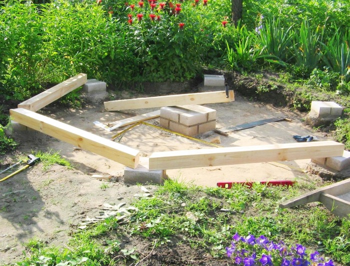 Затем выкопать четыре углубления на один метр. Размер каждой ямы должен немного превышать диаметр используемых труб. Обработать дно ям разровняв, и заполнить смесью песка и гравия слоем до десяти сантиметров. Далее установить трубы в подготовленные ямы, выставить их строго вертикально, заполнить пустоты гравием и тщательно утрамбовать.