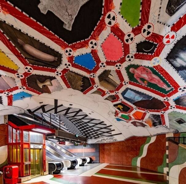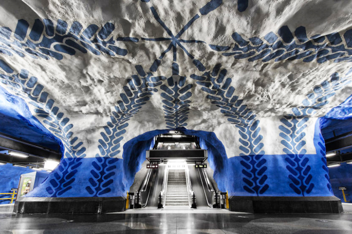 Стокгольмский метрополитен известен не только своей эффективностью и удобством, но также удивительными станциями, которые часто сравнивают с настоящими галереями под землей. Всего в метро Стокгольма есть 12 станций, которые выделяются своим уникальным дизайном и архитектурой. Открытие метро способствовало развитию города, улучшило транспортную доступность и сделало путешествие по столице Швеции более удобным и быстрым. А также и стало местной достопримечательностью, куда устремляется поток туристов по приезде в город. Стокгольм /Фото:mykaleidoscope.ru Метрополитен в Стокгольме был открыт в 1950 году, а первая линия метро, зеленая линия Т-17, протяженностью 21 км, была построена с использованием открытых методов выемки и проходила по центральным улицам города. Открытие метро в Стокгольме стало значительным событием в жизни города, поскольку облегчило транспортную доступность и позволило жителям и туристам быстро передвигаться по городу. С течением времени в Стокгольме открылись дополнительные линии метро, сеть была расширена и модернизирована. В настоящее время метро включает 3 линии (зеленую, красную и синюю) и 100 станций. Метрополитен в Стокгольме отличается своей чистотой, комфортом и привлекательным дизайном станций, многие из которых представляют собой произведения искусства. Метро в Стокгольме не только предоставляет удобное и быстрое перемещение по городу, но также является культурным объектом благодаря своим художественным украшениям и архитектуре некоторых станций. Остальные же не отличаются от станций любого другого метро. Карта метро /Фото:dzen.ru Особенно впечатляющими являются станции синей ветки, однако и на красной линии есть на что посмотреть. Многие из этих подземных станций буквально вырублены в скальных породах, создавая поистине грандиозное зрелище. А сделано это из-за особенностей геологической структуры города. Стокгольм находится на архипелаге, состоящем из множества островов, что делает строительство подземного метрополитена сложным и вызывает необходимость использования скальных пород в качестве естественной защиты. Кроме того, вырубка станций в скале позволяет сделать процесс строительства более экологически чистым, так как не требуется разрушение природы для создания подземных сооружений. Такой подход также обеспечивает более надежные и безопасные условия для пассажиров, так как скала служит естественным барьером от различных природных факторов. 1. Одной из самых известных станций является станция Т-Централен Прямо в скале /Фото:tourister.ru Она служит пересадочным пунктом между тремя линиями метро стокгольмского метрополитена и единственной в своём роде. Здесь можно увидеть удивительные скульптуры и инсталляции, созданные из различных материалов и изображений в синих тонах и растительных мотивах. Эта популярная станция была официально запущена в 1975 году. Доступ к ней осуществляется напрямую с железнодорожного вокзала или автовокзала через подземный длинный переход. Как и многие другие станции на данной линии, не имеет облицовки и выглядит как волшебная пещера. 2. Еще одной уникальной станцией является Кунгстрехн — Королевский сад Королевский сад /Фото:fishki.net Оформлена она словно подземный парк, на стенах выгравированы различные события из истории Швеции, а потолок украшен кристаллами. 