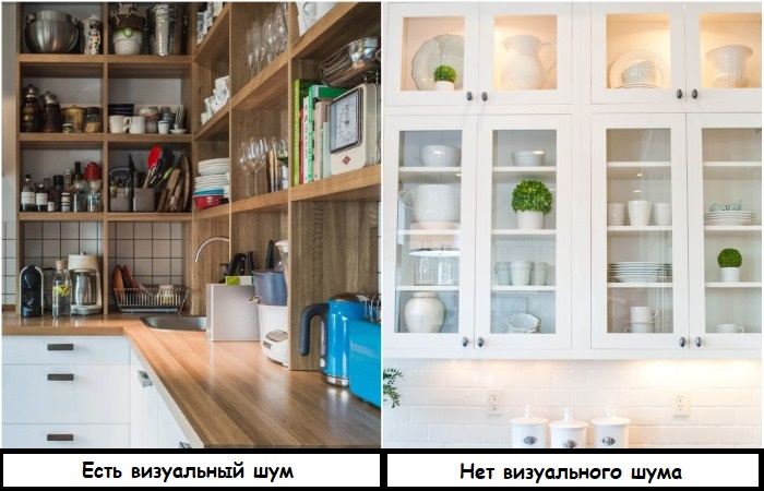 «Сердцем» визуального шума являются столешницы, особенно кухонные. Чего на них только нет! Емкости для хранения, специи, ножи и кухонная утварь на подставке, разделочные доски, мелкая бытовая техника, бумажные полотенца…Этот список можно продолжать вечно. А ведь большинство из этих вещей можно убрать в шкафы или на полки и, тем самым, разгрузить пространство.