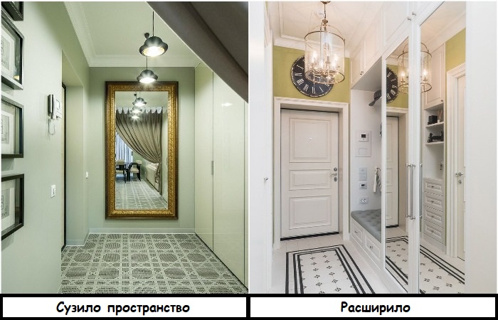 Хорошо, когда есть возможность повесить зеркало напротив окна. Этот прием удваивает количество солнечного света, который жизненно необходим для зрительного увеличения площади квартиры.