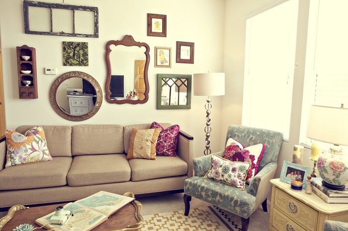 Композиция из зеркал над диваном. / Фото: akrasdia.ru