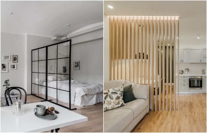 Важно, чтобы они были максимально легкими и воздушными, пропускали свет. Как вы понимаете, гипсокартоновые конструкции здесь точно неуместны. А вот деревянные рейки, стеллажи, стеклянные перегородки, полупрозрачные ширмы, японские шторы идеально разграничат ваше пространство. Главный плюс подобных конструкций состоит в том, что их легко установить уже после окончания ремонта.