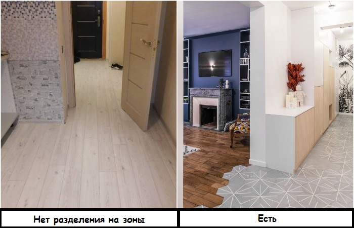Если вы находитесь еще на этапе ремонта, подумайте о том, чтобы визуально разделить комнаты с помощью разных напольных покрытий или ковров. Например, так можно зрительно отделить прихожую, которая сразу перетекает в гостиную. Используйте для входной зоны плитку, а для зоны отдыха – линолеум или ламинат. Также можно застелить зону прихожей ковром нужного размера – только смотрите, чтобы он был влагостойкий и практичный в уходе.