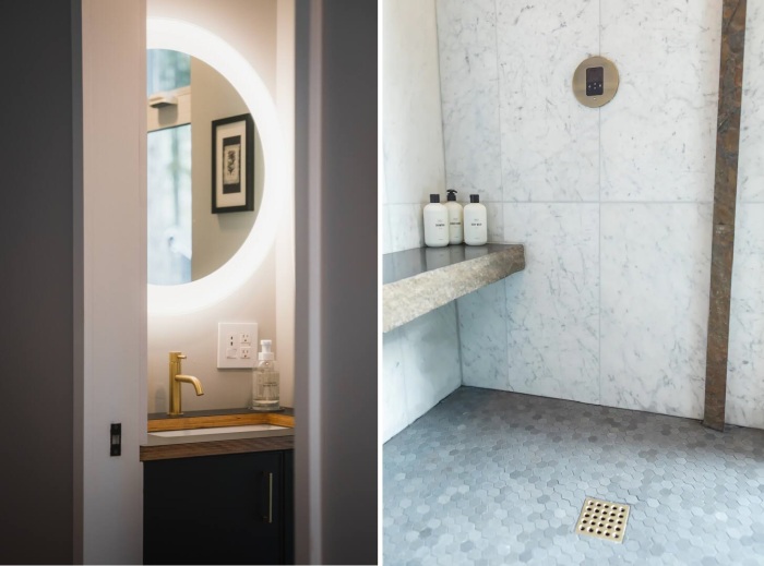 Кстати сказать, в ванной комнате также не поскупились на масштабное остекление, но за конфиденциальность переживать не стоит, поскольку The Sea Container Cabin находится на уединенной частной территории, превышающей 1 гектар лесного массива. При этом использовались и стеклянные раздвижные двери. Из главной спальни и ванной комнаты, например, можно попасть на открытый балкон, что расширяет и полезное жилое пространство, и обеспечивает постояльцам непосредственный контакт с природным окружением. Именно здесь и установлена гидромассажная ванна, которую можно принимать даже в межсезонье.
