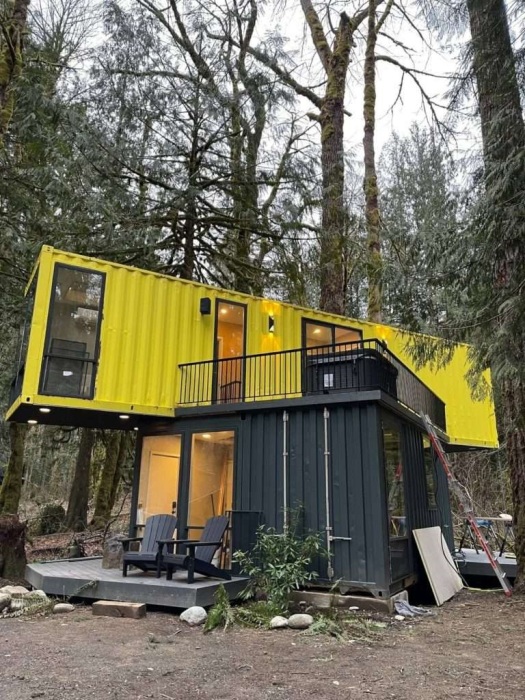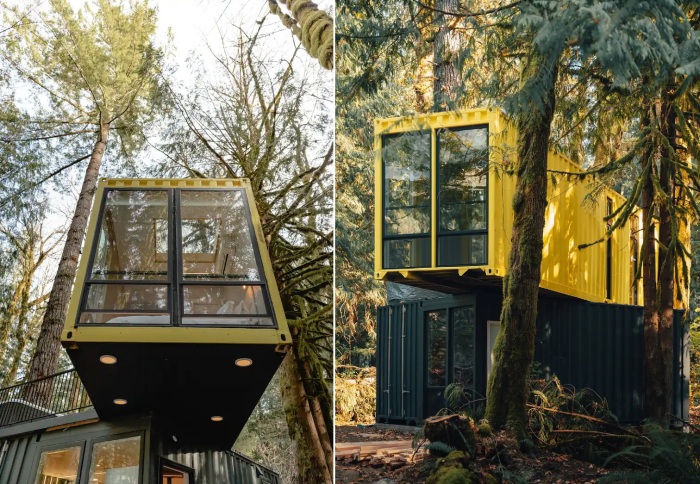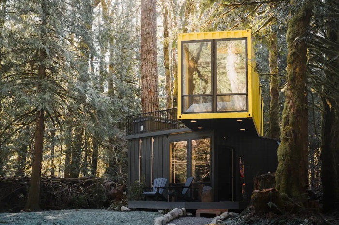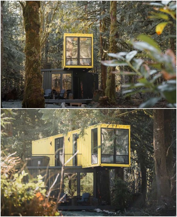 В связи с темпом современной жизни, растущей плотностью населения в крупных мегаполисах и их пригородах, а также со сложными экономическими условиями, все больше людей обращают внимание на альтернативные виды жилищ. На этой волне стали появляться пусть и скромных размеров дома, но в функциональности, экономичности и устойчивости им нет равных. Именно к таким структурам относятся грузовые контейнеры, которые активно стали использовать как для строительства жилищ, так и гостевых домиков. Как, например, домик для отдыха The Sea Container Cabin в предгорьях Каскадных хребтов штата Вашингтон. Гостевой контейнерный дом может стать и семейным, и романтичным местом отдыха на природе. Интерес людей к небольшим жилым пространствам стремительно возрастает, поскольку эти структуры более доступны в финансовом плане, что открывает двери для молодежи, пенсионеров и тех, для кого минимализм и устойчивость стали главной философией жизни. На страницах Novate.ru очень много интересных проектов крошечных домов, относящихся к альтернативному типу жилищ, но все же стильный домик с характерными особенностями и с говорящим названием The Sea Container Cabin («Морская контейнерная кабина») заслуживает особого внимания. Оттенок желтого цвета ярко выделяется на фоне пышной зелени окружающего леса. | Фото: dreamtinyliving.com. Расположенный в предгорьях Каскадных хребтов, неподалеку города Индекс (штат Вашингтон), небольшой гостевой дом, построенный из двух грузовых контейнеров, пусть и сохранил индустриальный облик с минималистичным дизайном, но цепляет оригинальностью расположения самих контейнеров и выбором цвета. Немаловажную роль сыграло и живописное окружение, ведь кабина предназначалась для отдыха на выходных. Оставалось лишь грамотно распределить пространство, поскольку организация жилых зон на миниатюрных площадях довольно сложная задача. Интересный принцип использования двух 40-футовых контейнеров для обустройства дома. | Фото: matadornetwork.com. Следуя главным принципам строительства и обустройства мини-жилищ – функциональность, простота и простор, авторы проекта использовали каждый квадратный сантиметр, чтобы отдых в «Контейнерной кабине» был максимально комфортным, не вызывал угнетающих ассоциаций из-за ограничений самой структуры морских контейнеров. Они, конечно же, имеют главное преимущество – мобильность, надежность, экологичность, модульная конструкция и возможность проведения преобразовательных процессов в мастерских, на производственных площадках или просто на заднем дворе своего участка, а также дают возможность создавать разнообразные структуры при штабелировании друг на друге, хотя и ограничены строгими параметрами габаритов. Контейнер, расположенный по диагонали, образует консольную структуру. Структурные особенности: За основу конструкции гостевого дома было взято два 40-футовых контейнера, общая внутренняя площадь которых составляет чуть более 57 кв. метров. При этом один из них был разрезан пополам, что позволило создать кубической формы нижний этаж. Второй контейнер установили на преобразованную основу по диагонали со смещением к одной стороне, что сделало его эстетически привлекательным и очень необычным архитектурным объектом. На террасе второго уровня обустроили гидромассажную ванну на дровах. Благодаря тому, что второй контейне