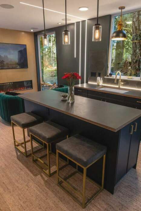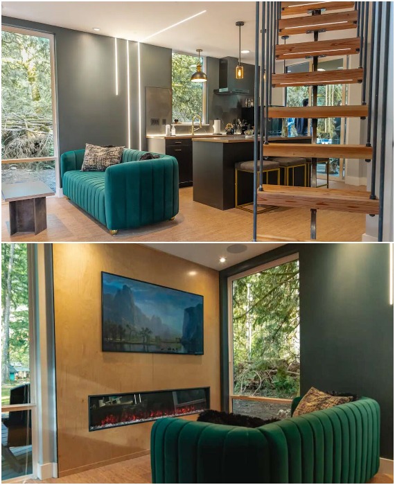Если говорить о планировке и оформлении внутреннего пространства, то прямо с порога гости попадают в гостиную, в которой уютную атмосферу создают изумрудного цвета с велюровой обивкой диваны, газовый камин во всю стену, добавляющий нотку тепла, а также окна от пола до потолка, открывающие обзор на великолепное природное окружение. Здесь имеется кинозона с объемным звуком и с 65-дюймовой ТВ-панелью, другие же стены украшают светодиодные световые художественные инсталляции.