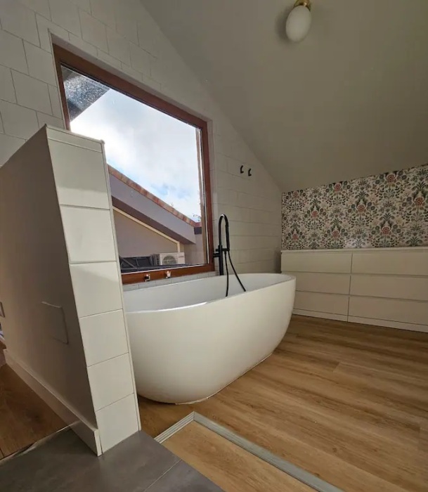 Две остальные спальни находятся на втором уровне, между которыми обустроили поистине роскошную ванную комнату с отдельно стоящей ванной у большого окна, раковиной, вместительной тумбой и туалетом. Сами же спальни также не остались без внимания дизайнеров. В каждой из них предусмотрено изысканное оформление, а в главной еще имеется и огромное окно, обеспечивающее потрясающими видами на живописное окружение, ведь высота расположения второго уровня увеличивает площадь обзора.