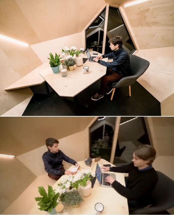 Создание удивительной деревянной структуры под названием Workstation Cabin стало логическим продолжением дизайн-экспериментов, основанных на экологичности, устойчивости и натуральности. Небольшой домик, имеющий 15 граней, изначально задумывался как миниатюрный конференц-зал, в котором с комфортом должно было поместиться 6 собеседников или пара тройка офисных работников, работающих над одним проектом. Но это было до пандемии.