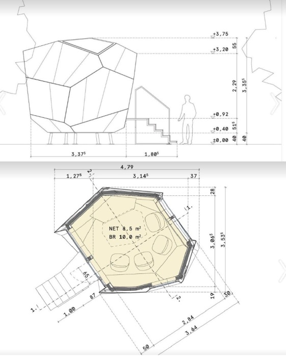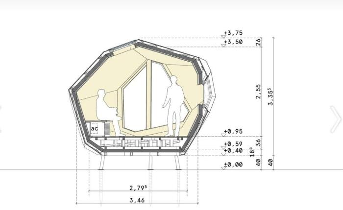 Учитывая асимметричную форму и разные размеры граней, разработчики воспользовались возможностями цифрового проектирования с использованием САПР. А каждую деталь панелей, как для внутренней отделки, так и для водонепроницаемой оболочки вырезали с помощью станка с ЧПУ. Стоит отметить, что любая модель имеет невысокие ножки. Это дает возможность не заморачиваться на предварительном создании фундамента, бетонной площадки или опорной конструкции из свай. Учитывая, что каждая модель собирается в заводских условиях, а затем доставляется в полностью собранном виде на нужную площадку на грузовике, неудивительно, что домашний офис буквально за считанные часы становится пригодным для использования.
