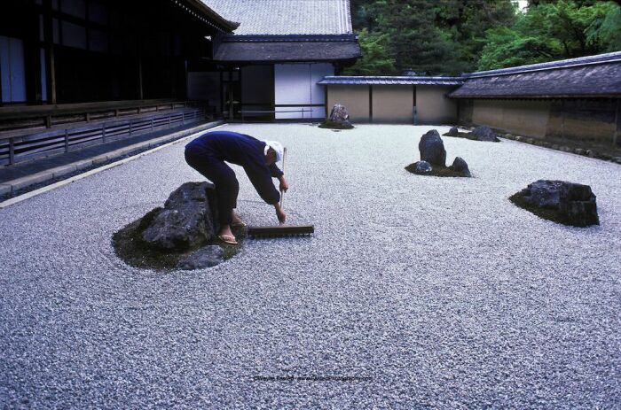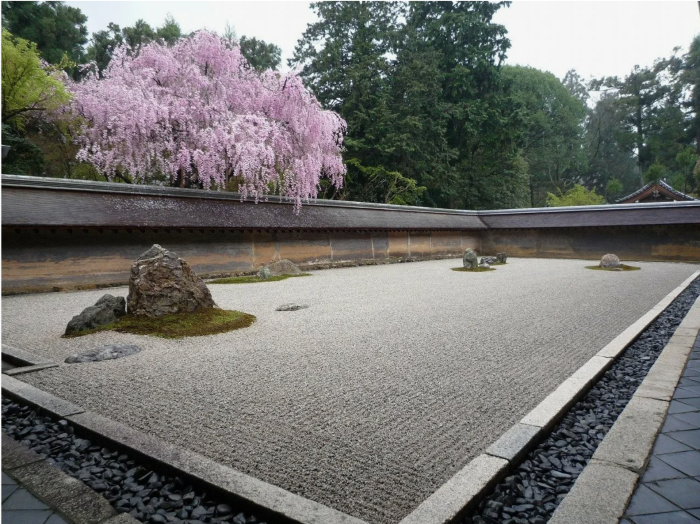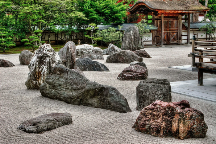 Например, знаменитый Рёандзи в Киото, древней столице Японии, существует с пятнадцатого века. Это небольшая площадка размером двадцать на десять метров, полностью покрытая однородным белым гравием. На ней расставлено пятнадцать камней, объединенных в небольшие группы, каждая из них окружена зеленым мхом.