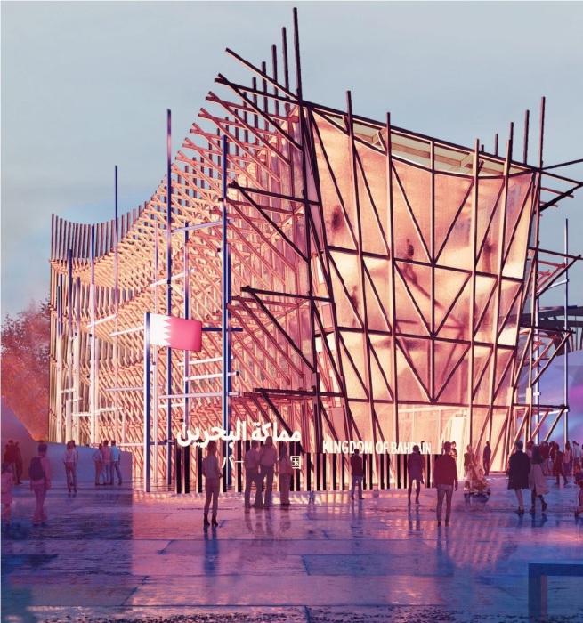 Дизайн павильона Бахрейна, созданный архитектором ливанского происхождения Линой Готмех и командой, основанной ею компанией (Lina Ghotmeh). Креативная команда в своем проекте решила акцентировать внимание на богатом морском наследии государства, раскинувшегося на 30 островах в Персидском заливе. Их павильон имеет форму традиционного деревянного парусника дау, подчеркивающего значимость Бахрейна как одного из основных портов Средней Азии. При этом использование эффектной деревянной конструкции отдает дань уважения мастерству японских плотников, создающих потрясающие шедевры из дерева.