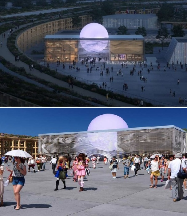 Нидерланды начали строить свой павильон под девизом «Общая почва: создаем новый рассвет вместе». В этом русле креативная команда сразу нескольких студий и инженерных компаний (RAU Architects, DGMR, Tellart, Asanuma) исследуют новые формы и методы строительства, чтобы подчеркнуть, как инновационные технологии позволяют использовать энергию воды для производства чистой энергии без вредных выбросов. Над павильоном «восходит солнце» в виде освещенной сферы, символизирующей бесконечную чистую энергию, устойчивость и цикличность, ну а сама вода, занимает заметное место, эффектно отражаясь на фасаде и крыше структуры.
