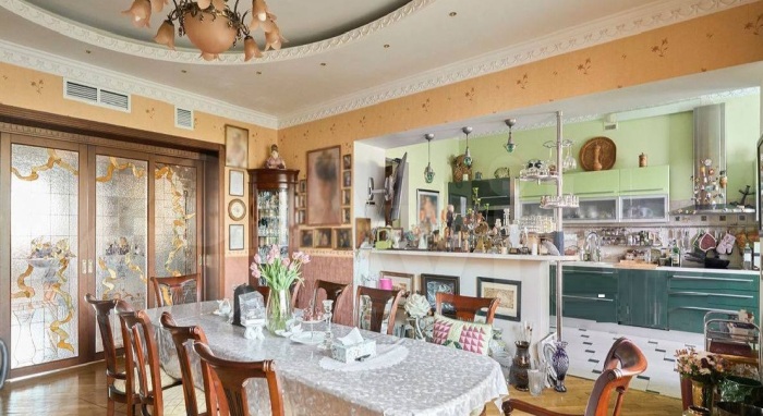Новость о мошенниках, чуть не лишивших элитной квартиры в центре Москвы народную артистку РФ Ларису Долину, всколыхнула Сеть и заставила задуматься многих. Но кто бы что не говорил или не думал, вопиющий случай подогрел интерес как к самой народной любимице, так и к ее недвижимости. И пока идут разбирательства, выясняется, что на самом деле произошло и кто виноват, у нас есть прекрасная возможность заглянуть в элитную московскую квартиру знаменитости в Хамовниках с рыночной стоимостью в 150 миллионов рублей. Лариса Долина стала жертвой крупной финансовой и квартирной аферы. | Фото: mydecor.ru. Имя Ларисы Долиной сегодня можно увидеть везде и связано это, с вопиющим случаем произошедшим с известной на всем постсоветском пространстве певицей. Все обсуждают инцидент с элитной квартирой звезды, которой она чуть не лишилась из-за убедительной наглости и безнаказанности мошенников, нагло расплодившихся настолько, что даже известные личности умудряются попасться на их удочку. Элитный дом в Ксеньинском переулке в Хамовниках, где находится 5-комнатная квартира Ларисы Долиной (Москва). Напомним: Сеть пестрит информацией, что Лариса Долина собственноручно перевела на счет «разводил», старающихся «сберечь» ее банковские вклады, на 98 млн рублей. Затем знаменитость и вовсе неожиданным образом продала 5-комнатую квартиру площадью 236 кв. м в Ксеньинском переулке Москвы, лишившись при этом и элитного жилья, и вырученных средств в размере 112 млн рублей, которые отправились туда же, на «безопасный счет». При этом «фиктивная» продажа происходила в уважаемом агентстве недвижимости, а покупатель был вполне реальный и с настоящими деньгами, которых также лишился, как, скорее всего, и квартиры в Хамовниках – центральном административном округе и одном из самых дорогих районов столицы. Лариса Долина в своей квартире, рыночная стоимость которой составляет 150 млн рублей. | Фото: woman.ru. Друзья и коллеги в холле московской квартиры, площадь которой достигает внушительных 236 кв. метров. | Фото: blitz.plus. Редакция Novate.ru предлагает оставить разбирательство компетентным органам, а самим заглянуть в квартиру, которая по рыночной цене стоит около 150 миллионов рублей. Хотя, как говорит ценник сделки, и в этом случае знаменитость потеряла, поскольку согласилась на меньшую сумму (поговаривают, из-за спешки и желания спасти хоть что-то). Подвесные потолки и обилие витражей – привет от «евроремонтов» 2000-х гг. | Фото: mydecor.ru. Учитывая, что последнее время Лариса Александровна живет в Подмосковье, точнее сказать в элитном поселке Славино (Мытищинский район), то ожидать ультрасовременных дизайнерских фишек и инновационных внедрений в ее московской квартире не приходится. Так что «новые владельцы», которым придется пережить немало сложностей и судебных заседаний, чтобы доказать, что они действительно «добросовестные покупатели» (вполне официальный статус, позволяющий вернуть хотя бы часть денег) попадут в эпоху модных в начале 2000-х гг. «евроремонтов». Натуральное дерево было в приоритете. | Фото: aif.ru. Стразу же стоит оговориться, что по мнению экспертов, все отделочные материалы, двери, мебель, текстиль и т. д. из разряда дорогих (известная певица не поскупилась на обустройство своего жилища). Ну а в дизайне, общей эстетике и пристрастиях в выборе стиля оформления, цветовой гаммы 