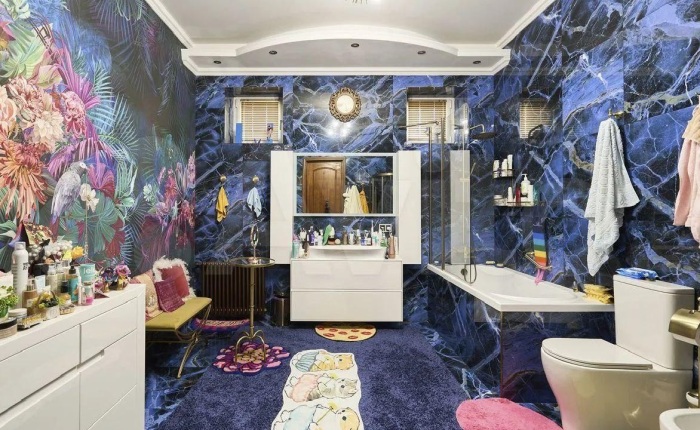 Но вершиной дизайнерского эксперимента стало оформление огромной ванной комнаты, которая зрительно уменьшилась в размерах из-за темно-синей плитки с причудливыми цветочными мотивами и «мраморными» прожилками, пронизывающими все плоскости покрытия. Но в этом вопросе, каждый владелец делает так, как ему нравиться и хочется, так что судить о выборе цвета и дизайна мы не вправе. В продолжение темы необычных дизайнерских находок в оформлении звездной недвижимости наших знаменитостей, предлагаем заглянуть в эксцентричный особняк Сергея Пенкина в Подмосковном Ромашково.
