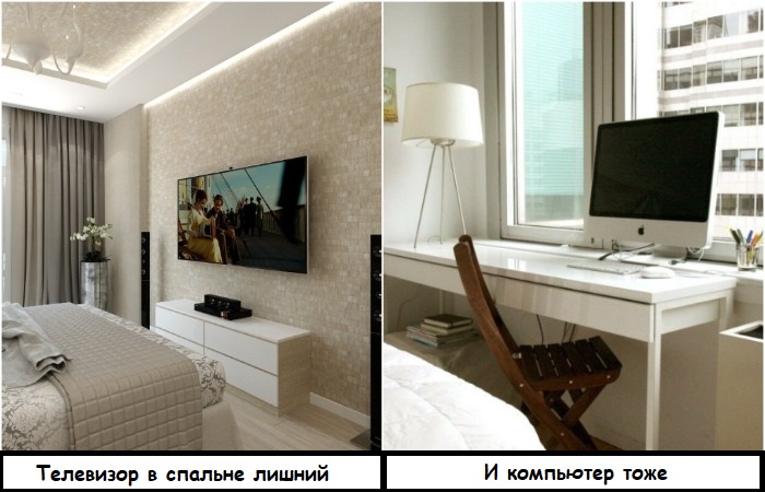 Спальня создана для отдыха и крепкого сна, поэтому при ее оформлении лучше ограничиться необходимой мебелью и осветительными приборами. А вот от техники лучше отказаться. Телевизор, ноутбук и прочие гаджеты отвлекают от сна, будоражат нервную систему и не позволяют быстро отправиться в объятия Морфея. Постарайтесь досматривать любимые сериалы в гостиной, а в спальню идти тогда, когда вы уже готовы лечь в кровать, укрыться одеялом, закрыть глаза и наслаждаться тишиной. Если вы работаете дома или часто приносите домой бумаги из офиса, которые нужно изучить, организуйте кабинет где-угодно, но только не в спальне. Эта комната не должна вызывать ассоциации с работой. Кроме того, чем меньше световых и шумных раздражителей будет в спальне, тем быстрее получится засыпать.