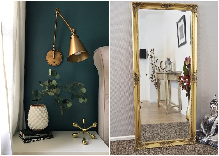 Интерьер должен получиться в стиле «шик-блеск», а не «дорого-богато», поэтому подбирайте детали дозированно. Например, в интерьер отлично впишутся золотые светильники, и такая же по оттенку фурнитура. Ножки на мебели и рамки для зеркал тоже могут быть благородного оттенка. А если вам не нравится золото, отдайте предпочтение хрому или меди – у них схожие декоративные свойства.