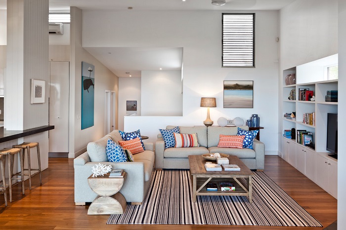 Чем меньше квартира, тем больше жертв приходится приносить для создания уютного и функционального пространства. Например, не всегда есть возможность поставить полноценную двуспальную кровать, поэтому приходится делать выбор в пользу раскладного дивана. Для того, чтобы визуально отделить эту зону от других, используйте ковер – он обозначит ту область, где вы отдыхаете и собираетесь с друзьями. Отлично, если в ковре будут собраны основные цвета, использованные в интерьере, – тогда картинка получится более целостной и гармоничной.