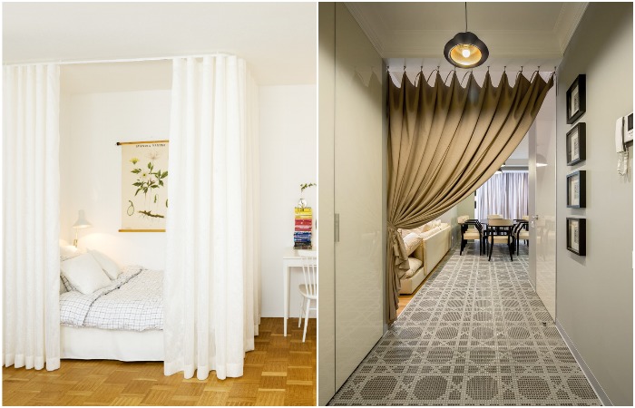 Для того, чтобы отделить спальню от остальной части квартиры, лучше всего подходят шторы и балдахины. Идеально, если кровать будет располагаться в нише. Все, что нужно – сделать в потолке скрытый карниз и повесить выбранные занавески. Ткань может быть легкой и светлой, а может и более плотной. Только в последнем случае важно, чтобы шторы не были слишком тяжелыми, иначе вы перегрузите интерьер. В открытом виде занавески будут работать в качестве декора, а в закрытом создадут уютное спальное место, скрытое от посторонних глаз.