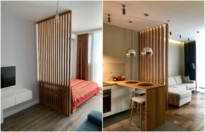 Этот вариант зонирования уже давно является базовым. Несмотря на то, что в последнее время рейки ушли в тень, уступив место более трендовым решениям, на их функциональности и эстетичности этот никак не отразилось. Обычно реечную перегородку устанавливают между зонами спальни и гостиной, но совсем необязательно, чтобы она шла от стены до стены. Если вы хотите, чтобы интерьер не потерял свою легкость, но при этом получил смысловое разделение, сделайте перегородку недлинной, чуть больше глубины дивана. Кстати, благодаря такому приему будет гораздо удобнее передвигаться между зонами.