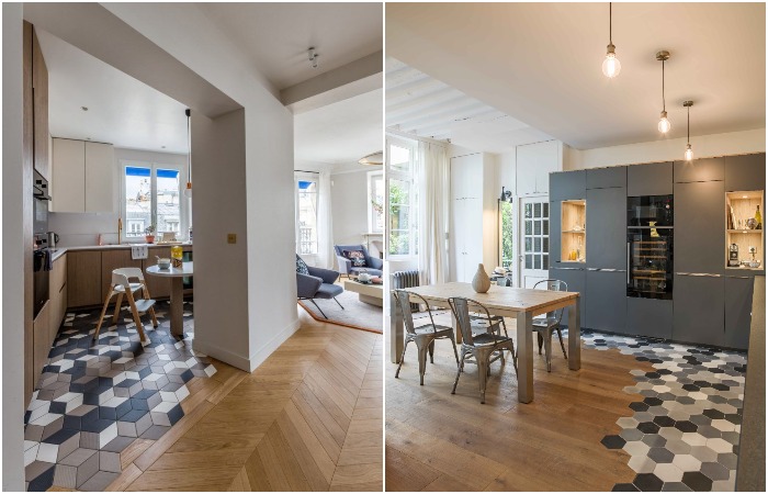 Для разделения студии на зоны прекрасно подойдут напольные покрытия. Они не обязательно должны быть выполнены из разных материалов, например, плитки и линолеума. Можно взять ламинат двух оттенков или уложить напольное покрытие на разных уровнях. Конечно, таким способом вы не сможете изолировать спальню от гостиной, или гостиную от кухни, однако визуально разделить коридор и основную комнату – вполне. Отличным вариантом будет плитка на кухне и ламинат в зоне отдыха. Во-первых, получится красивая визуальная картинка, а во-вторых, получится защитить ламинат от влаги, жира, кусочков пищи и прочих загрязнений, что продлит срок его эксплуатации.